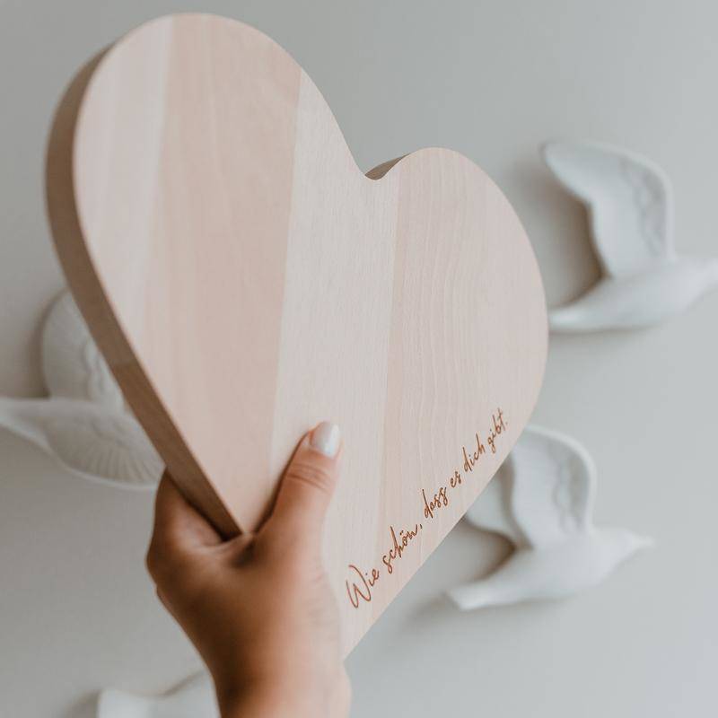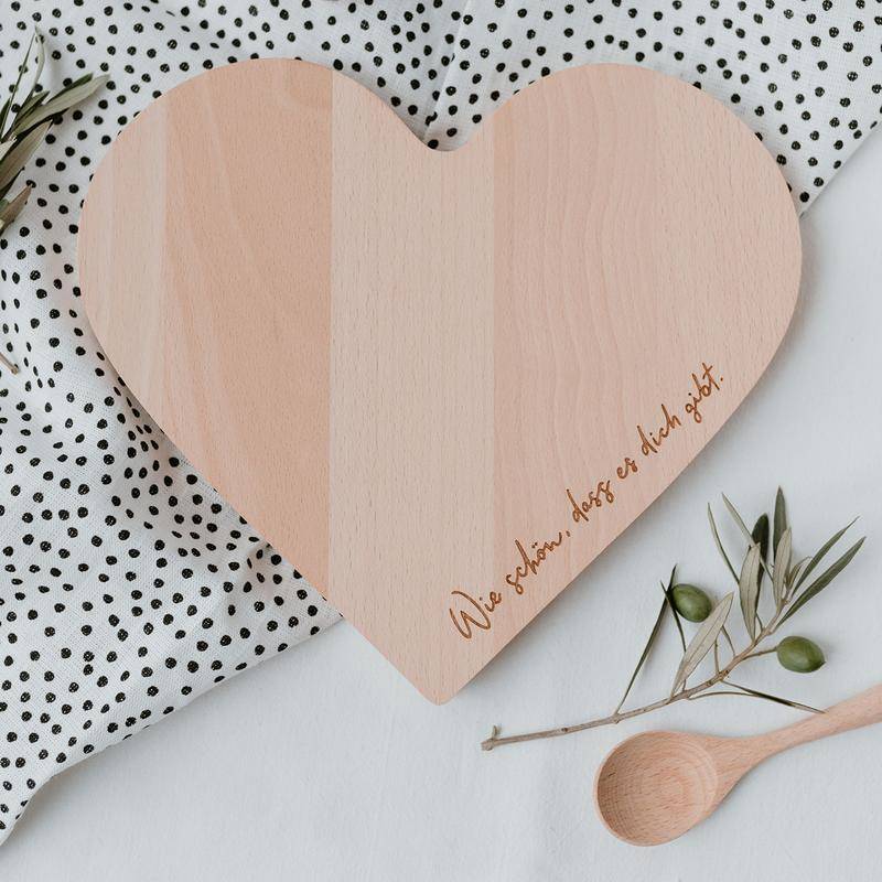 Für die Detailverliebten unter Euch wurde auf der Vorderseite der Spruch “Wie schön, dass es Dich gibt” per Laser eingraviert. Das Frühstücksbrettchen Herz hat auf der Rückseite ein kleines Eulenschnitt-Logo.