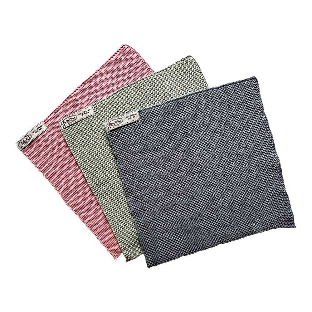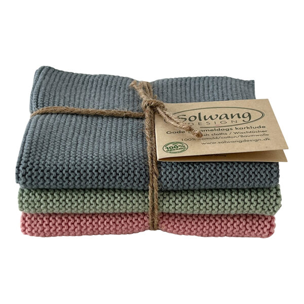 Gestrickte Küchenlappen aus Bio-Baumwolle, 3er-Pack, 25 x 25 cm, Staubig Grau, Grün, Rosa