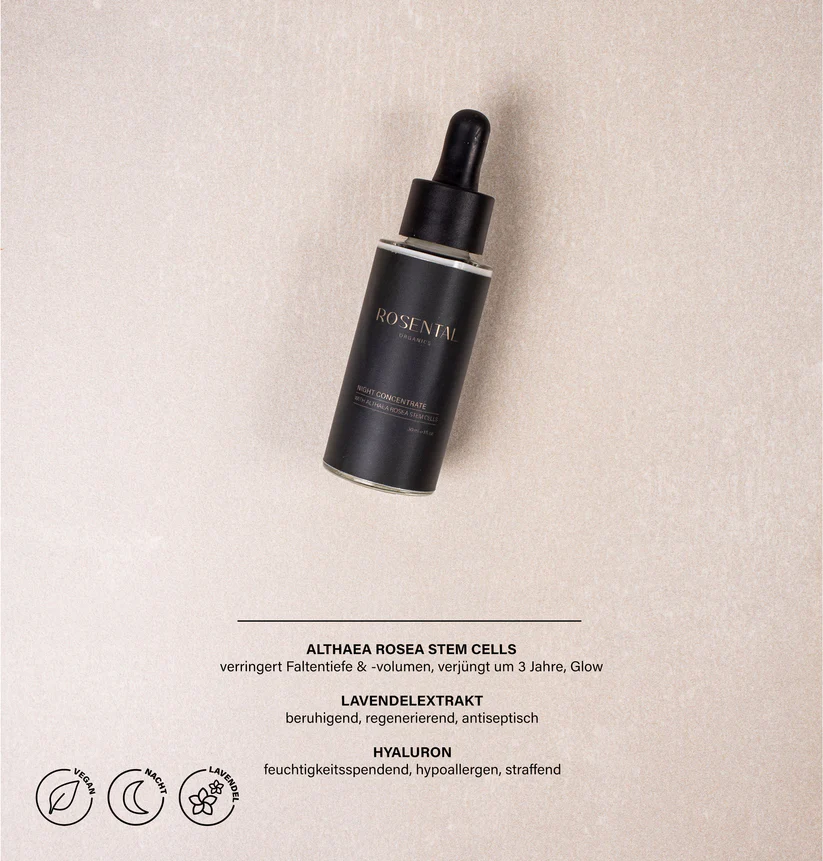 Erlebe die transformative Kraft der Nachtpflege mit dem Night Concentrate von Rosental Organics, angereichert mit den innovativen Althaea Rosea Stammzellen. Dieses Konzentrat ist ein wahrer Jungbrunnen für deine Haut, der die Zeichen der Hautalterung gezielt bekämpft und deine Haut über Nacht regeneriert und verjüngt.