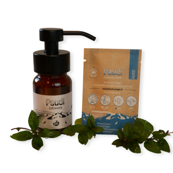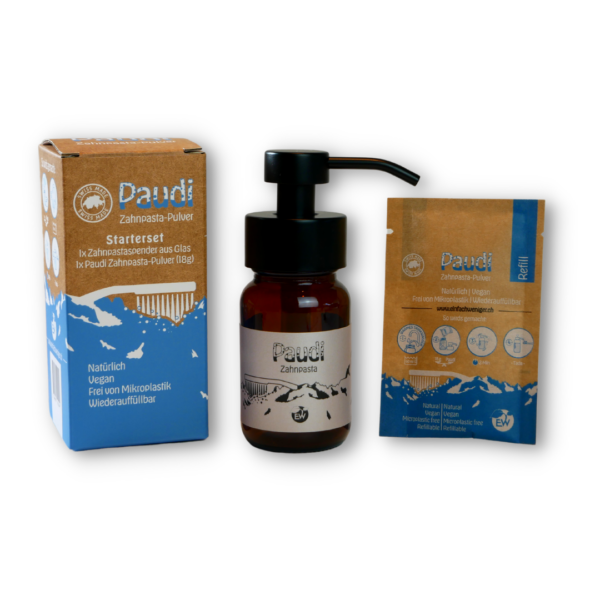 Paudi Starterset ist ein kleines Sรคckchen Pulver, welches in Verbindung mit Wasser zu Zahnpasta wird. Eine absolute Neuheit.ย