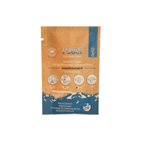 Mit Paudi Zahnpasta Pulver wird nachhaltiges Zรคhneputzen endlich auch bequem! Paudi ist ein kleines Sรคckchen Pulver, welches in Verbindung mit Wasser zu Zahnpasta wird. Eine absolute Neuheit. Sag tschรผss zu Zahntabletten, Pulver und Zahnseife. Mit dem Paudi Zahnpasta Pulver putzt du wie gewohnt mit Gel die Zรคhne verzichtest aber bewusst auf den Verpackungswahn!