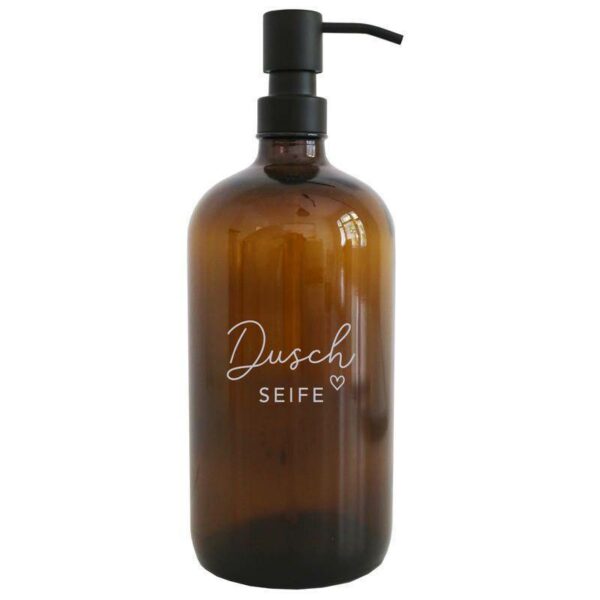 Das schรถne Braunglas mit weisser Schrift macht den Seifenspender zu einem absoluten Hingucker in deinem Bad und Gรคstebadezimmer! Der handgeschriebene Schriftzug “Duschseife” sowie ein kleines Herz zieren die Vorderseite, der Eulenschnitt Schriftzug die Rรผckseite des Spenders.